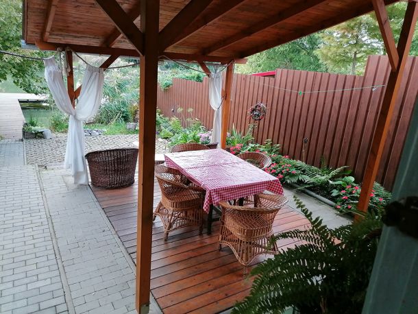 A ház bővítménye a kellemes terasz, kényelmes kültéri fonott bútorokkal.